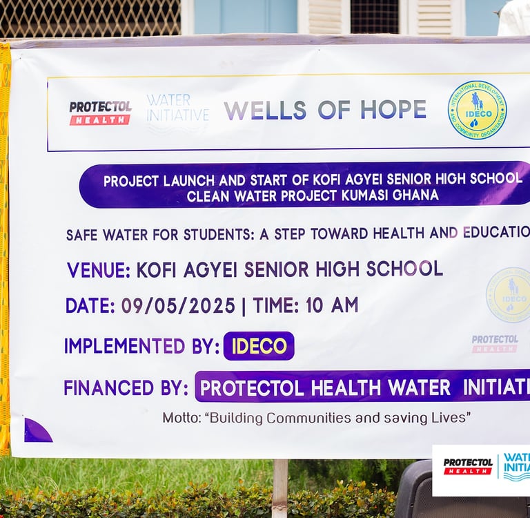 The International Development and Community Organization (IDECO), in partnership with Protectol Water Initiative (PWI), implemented a Pilot Water Project at Kofi Agyei Senior High/Technical School in Bampenase, addressing limited access to clean water that affected health, hygiene, and academic performance, particularly for girls.